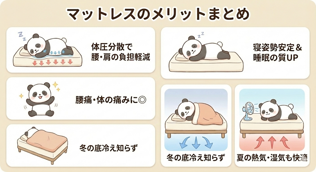 マットレスのクッション性によって体重が分散されるため、床に布団を敷いて寝るよりも腰や肩への負担が軽減されます。特に腰痛持ちの方や、朝起きたときに体の痛みを感じやすい方にとって、この違いは大きいかもしれません。