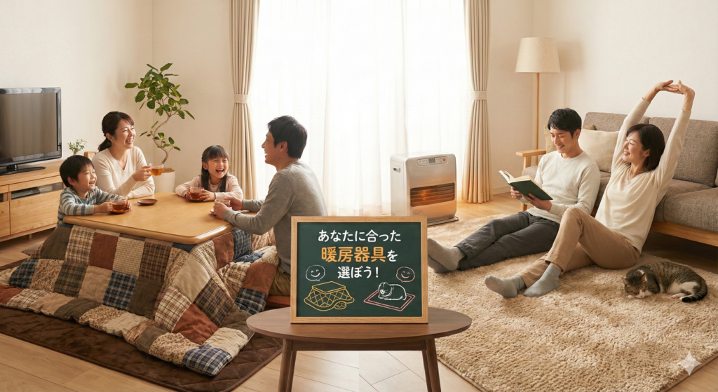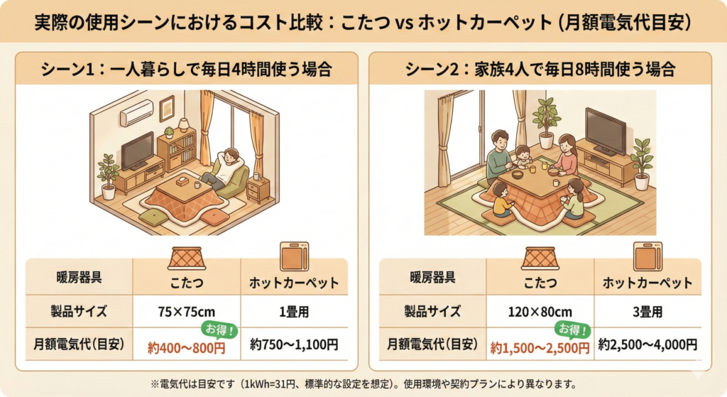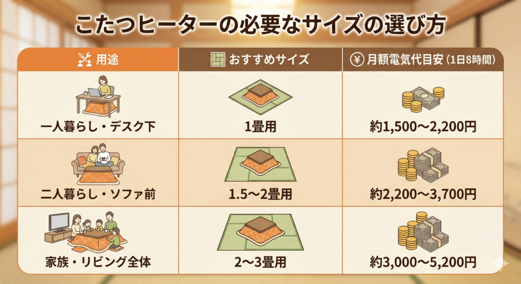 家族で使う場合は差がより大きくなり、こたつの方が月額で約1,000〜1,500円程度安くなる可能性があります。