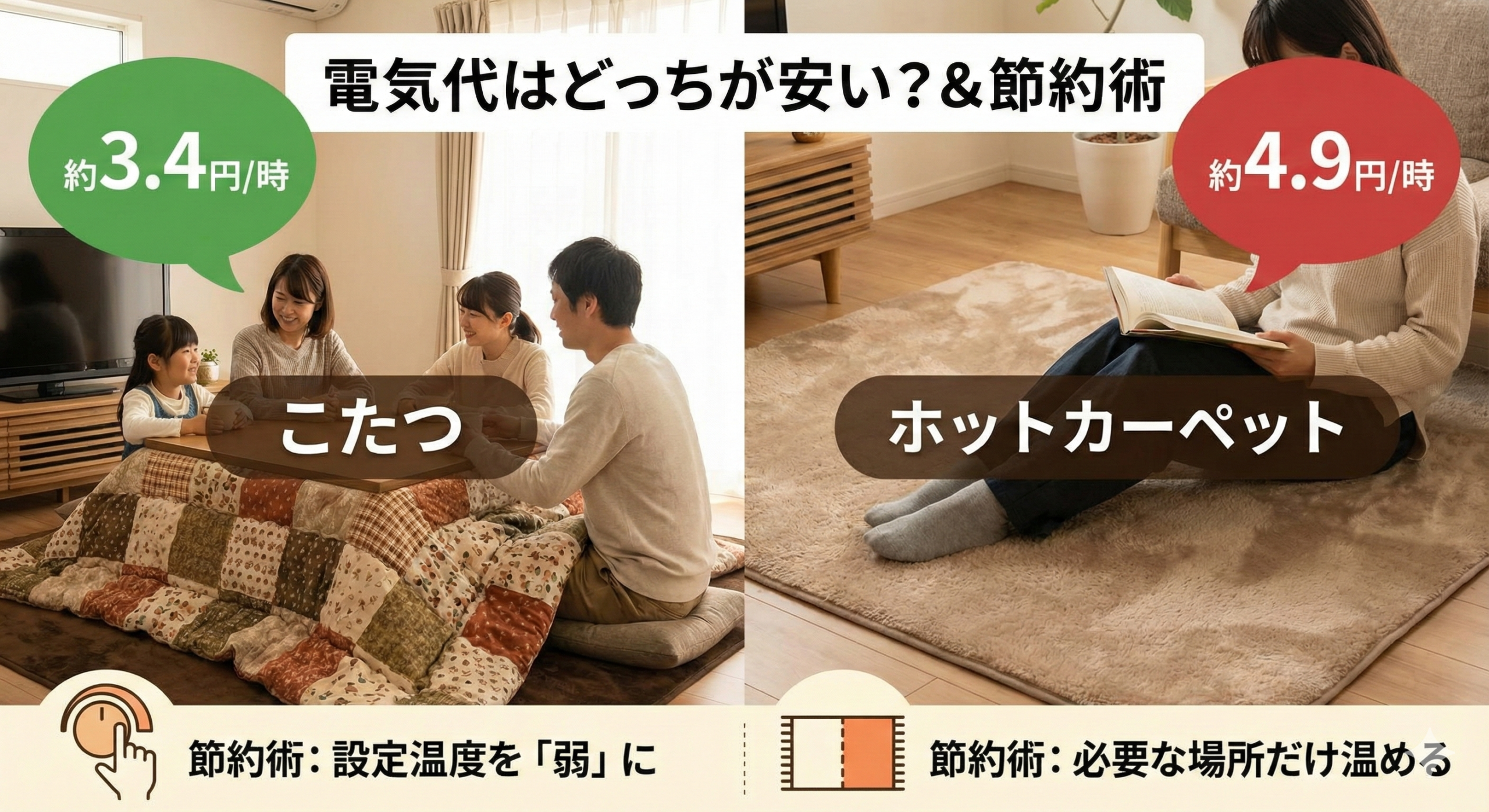 電気代だけで比較すると、こたつの方がお得です。同じ使用時間で比較した場合、こたつはホットカーペットより月額で数百円〜1,500円程度安くなる傾向があります。