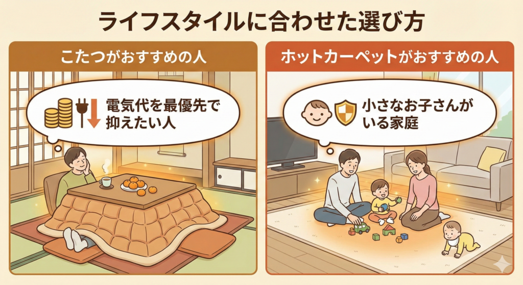 - 電気代を最優先で抑えたい人:同条件ならこたつの方が安い