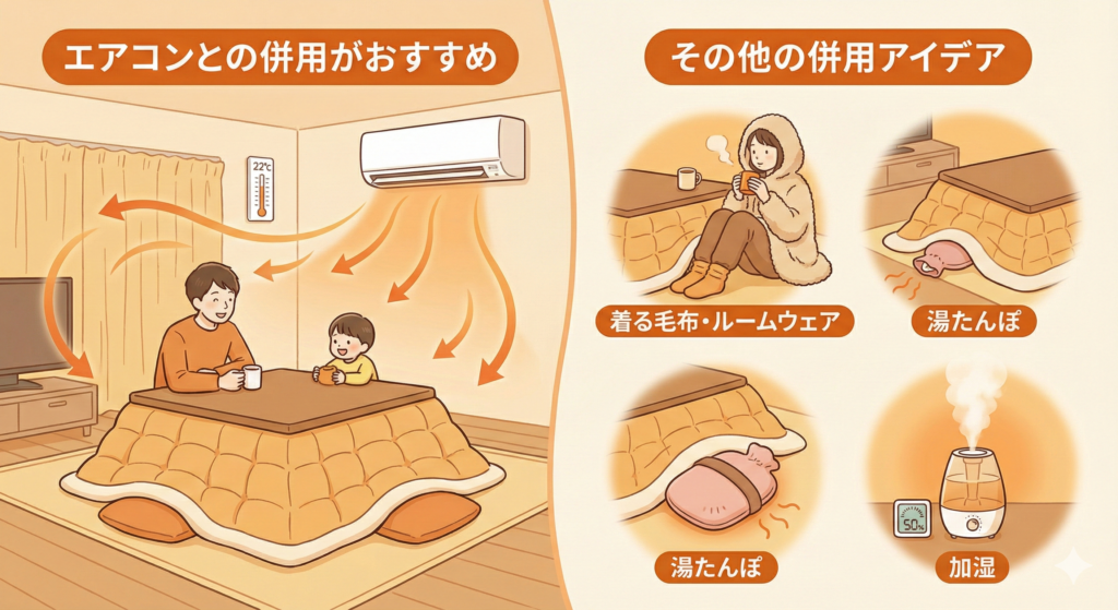 広い空間では、こたつ一台だけでは寒く感じることが多いです。ホットカーペットの分割運転機能を活用して必要な場所だけを暖めつつ、エアコンで部屋全体の温度を底上げする使い方が効率的です。