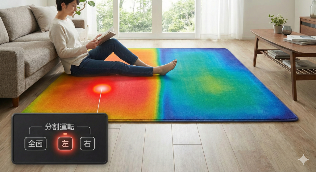 多くのホットカーペットには「分割運転機能」が付いています。例えば2畳用のカーペットで、左半分だけ、右半分だけを暖めるといった使い方ができます。一人で使うときは半分だけONにすれば、電気代を抑えることも可能です。
