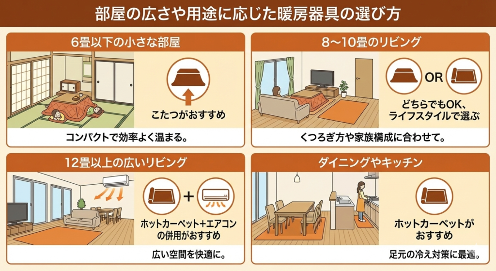 ここまで電気代やメリット・デメリットを見てきましたが、結局どちらを選べばいいのでしょうか。ライフスタイルや部屋の条件に合わせた選び方を解説します。
