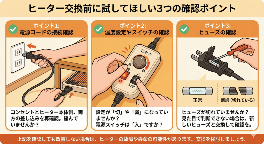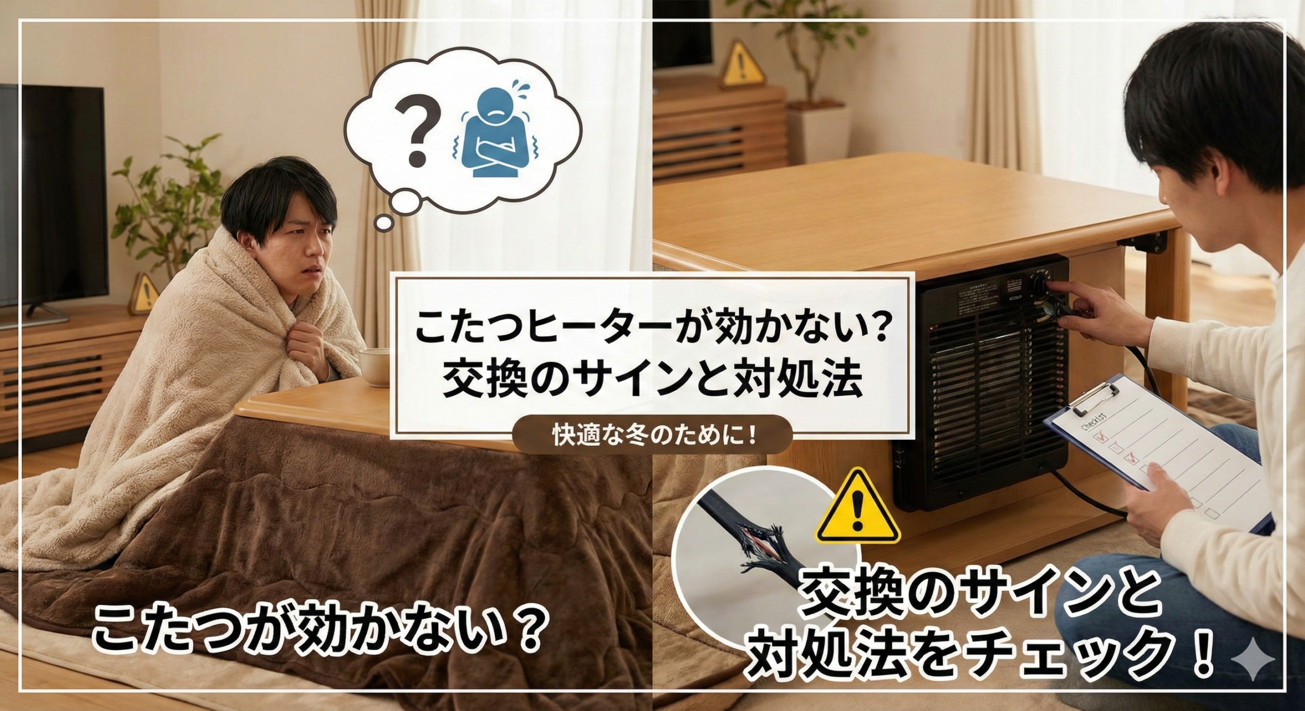 これら3つのポイントを確認しても問題が解決しない場合は、ヒーター本体の故障や寿命の可能性が高いです。その場合は、いよいよヒーター交換や、こたつ全体の買い替えを検討するタイミングと言えるでしょう。