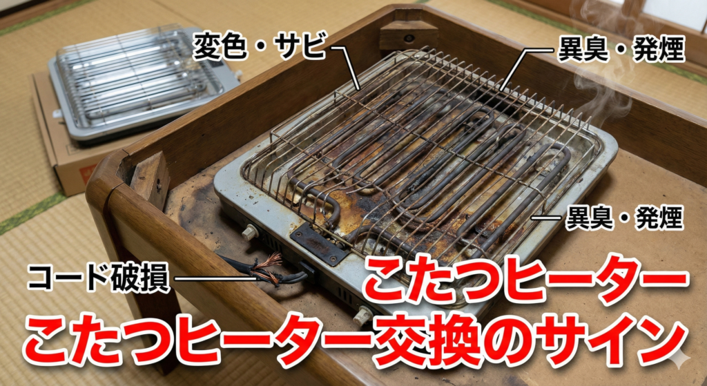 こたつヒーターの交換時期を見極める上で、以下のような症状が現れたら要注意です。これらは明確な「交換のサイン」と言えるでしょう。