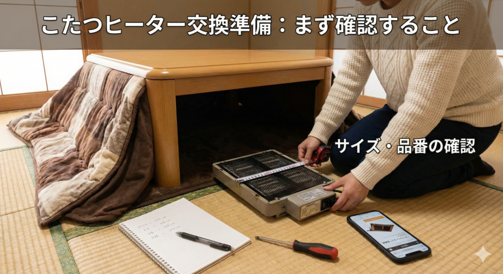 こたつヒーターを交換する前には、いくつか重要な確認事項があります。適切な準備をしておくことで、スムーズな交換作業ができ、購入後に「サイズが合わない」「取り付けられない」といったトラブルを避けることができます。ここでは交換対応の可否や木枠の扱い方、測定の方法など、交換を進めるための基本的な手順を詳しくご紹介します。
