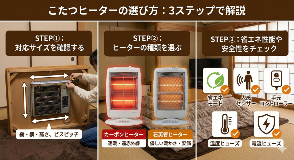 こたつヒーターを交換する際には、自分のこたつに合った製品を選ぶことが何より重要です。サイズが合わない、機能が不十分、といった失敗を避けるために、ここでは選び方を3つのステップに分けて詳しく解説します。この手順に従えば、初めての方でも安心してヒーターを選べますよ。