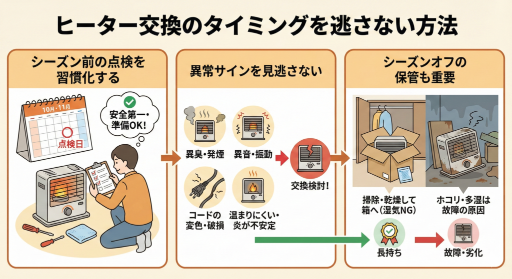 これらの症状を放置すると、安全性が損なわれるリスクが高まるだけでなく、寒い日に突然使えなくなって困ることにもなりかねません。「少し調子が悪いかな?」と感じたら、早めにヒーターの状態をチェックして、必要に応じて交換を検討しましょう。