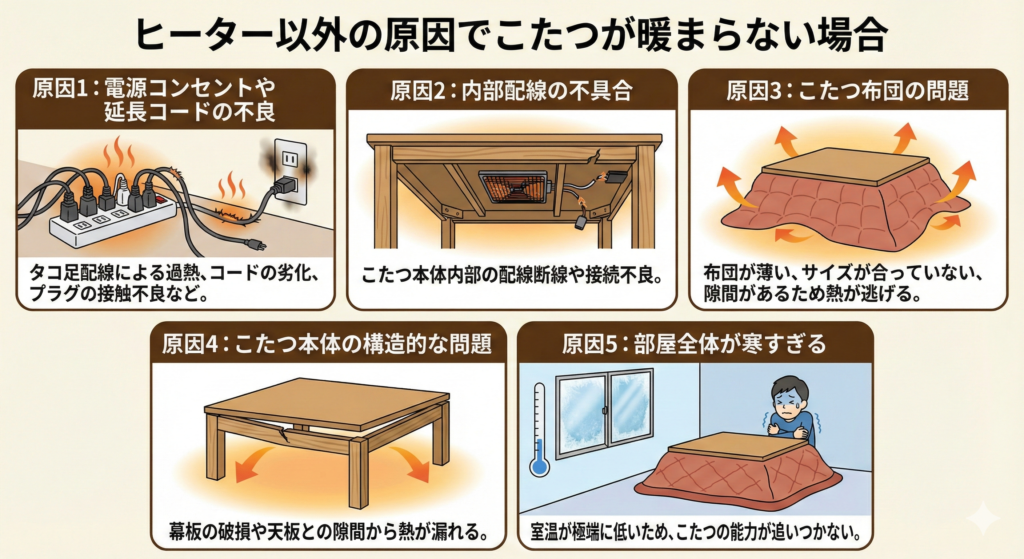 ヒーター自体は正常に動作しているのに、なぜかこたつが暖まらない、ということもあります。この場合、ヒーター以外に原因があると考えられます。
