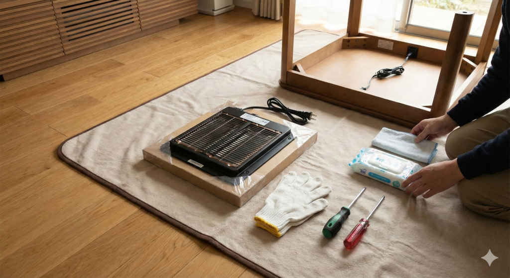 また、作業スペースも確保しておきましょう。こたつを裏返して作業するため、こたつよりも広いスペースが必要です。床に傷がつかないよう、毛布や段ボールなどを敷いておくと安心です。