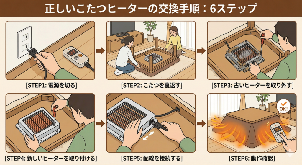 いよいよ実際の交換作業に入ります。こたつヒーターを安全かつ確実に交換するためには、適切な準備と正しい手順を守ることが大切です。ここでは、交換に必要な工具や具体的な作業手順、注意すべきポイントを詳しく解説していきます。初めての方でも、この手順に従えば安心して作業を進められますよ。