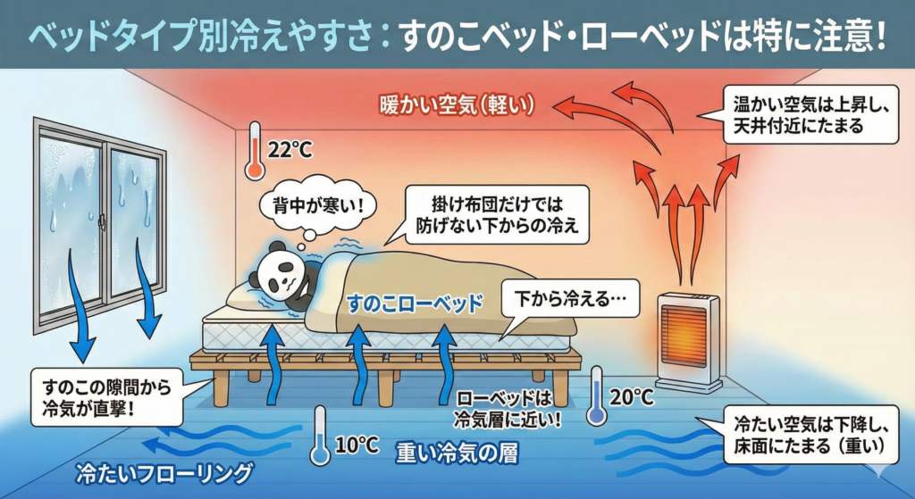 また、床に近いローベッドやフロアベッドも、床面にたまった冷気の影響を受けやすい構造です。ベッドの高さが低いほど、より冷たい空気の層の中で眠ることになります。