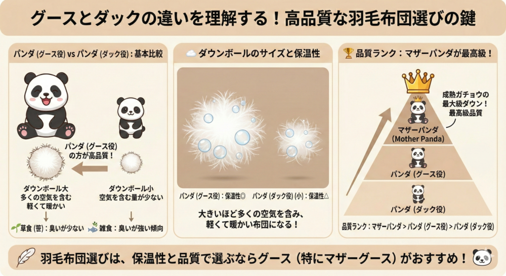 グースはダックより体が大きく、採れるダウンボールも大きくなります。大きなダウンボールはより多くの空気を含むため、保温性が高まります。また、グースは草食なのに対しダックは雑食のため、ダックの羽毛は獣臭が強い傾向があります。