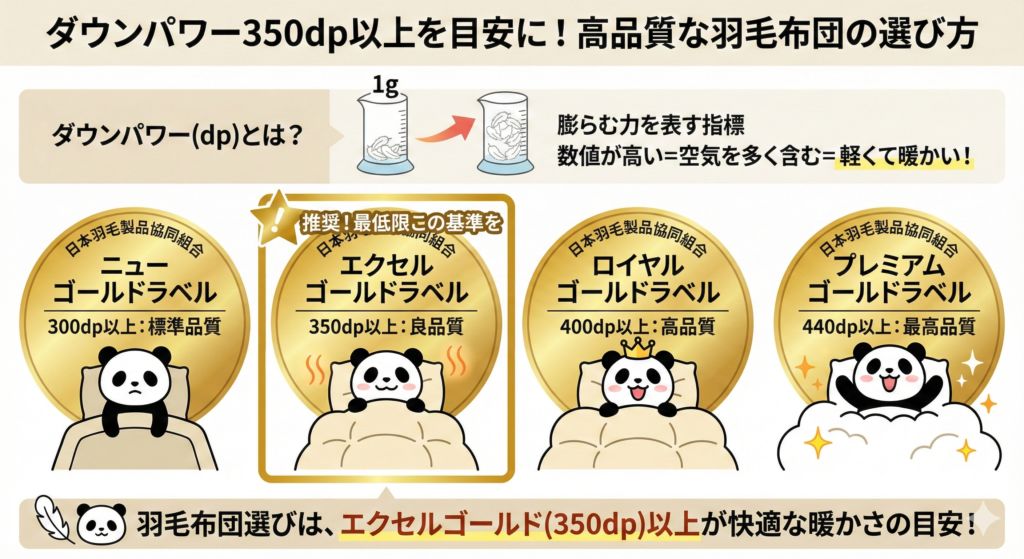 ダウンパワー350dp以上を目安に