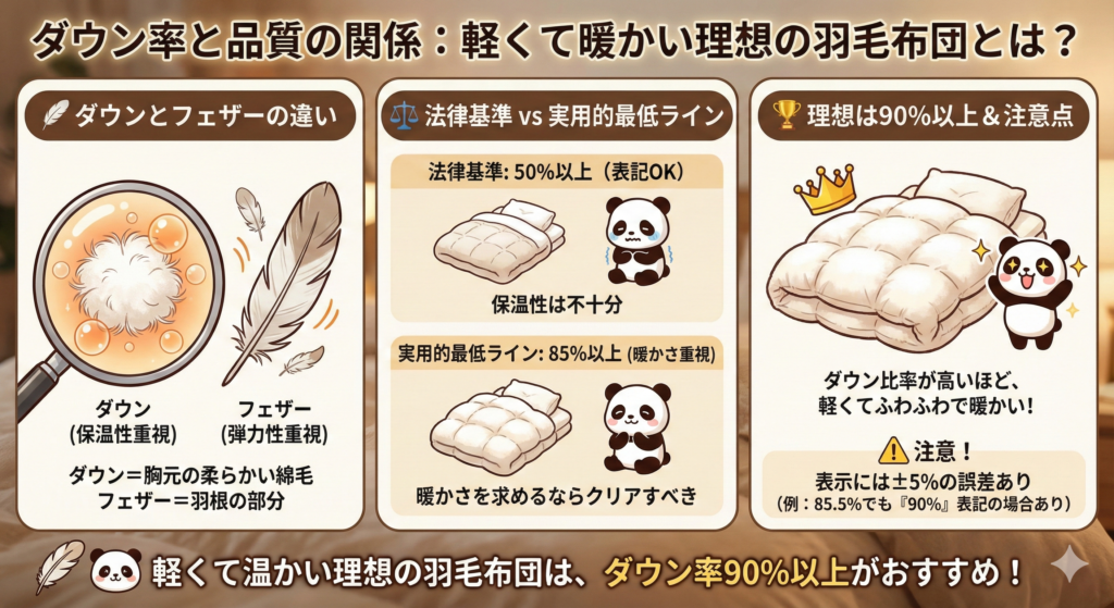 法律上、ダウン率50%以上あれば「羽毛布団」と表記できますが、暖かさを求めるならダウン率85%以上が最低ライン、90%以上が理想です。ダウン率が高いほど軽くてふわふわ、そして暖かい布団になります。