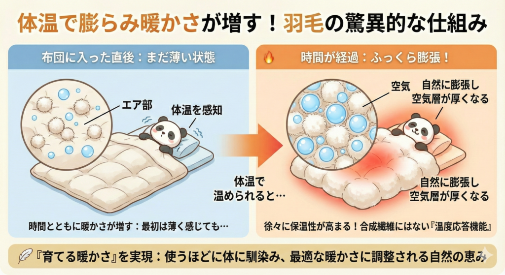 羽毛布団には、体温を感知して膨らむという他の素材にはない特性があります。人が布団に入ると、体温で温められた羽毛が自然に膨張し、空気の層がさらに厚くなります。