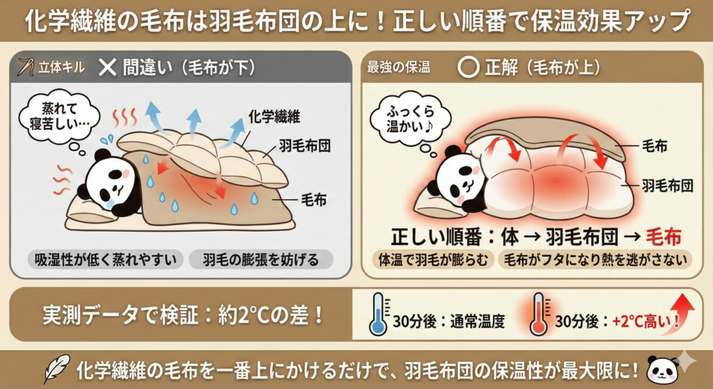 羽毛布団の上に毛布をかけることで、毛布が「フタ」の役割を果たし、羽毛布団から熱が逃げるのを防ぎます。実験では、この順番で30分後に通常より約2℃高い温度を記録したというデータもあります。