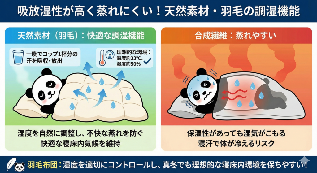合成繊維の布団は保温性があっても蒸れやすく、寝汗で体が冷えてしまうことがあります。一方、羽毛布団は湿度を適切にコントロールするため、真冬でも快適な寝床内気候(温度約33℃、湿度約50%)を保ちやすいのです。
