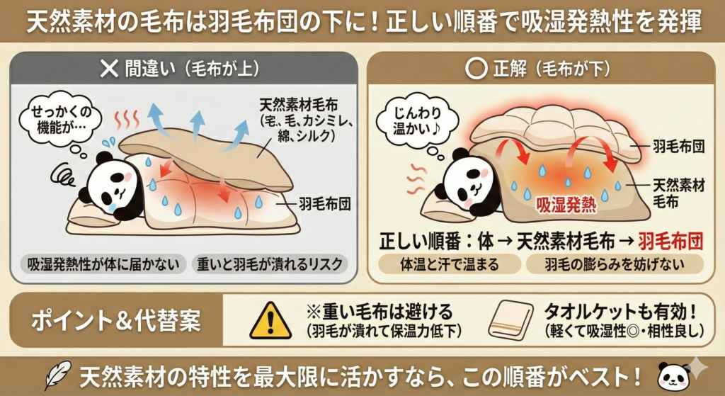 天然素材の毛布は羽毛布団の下に