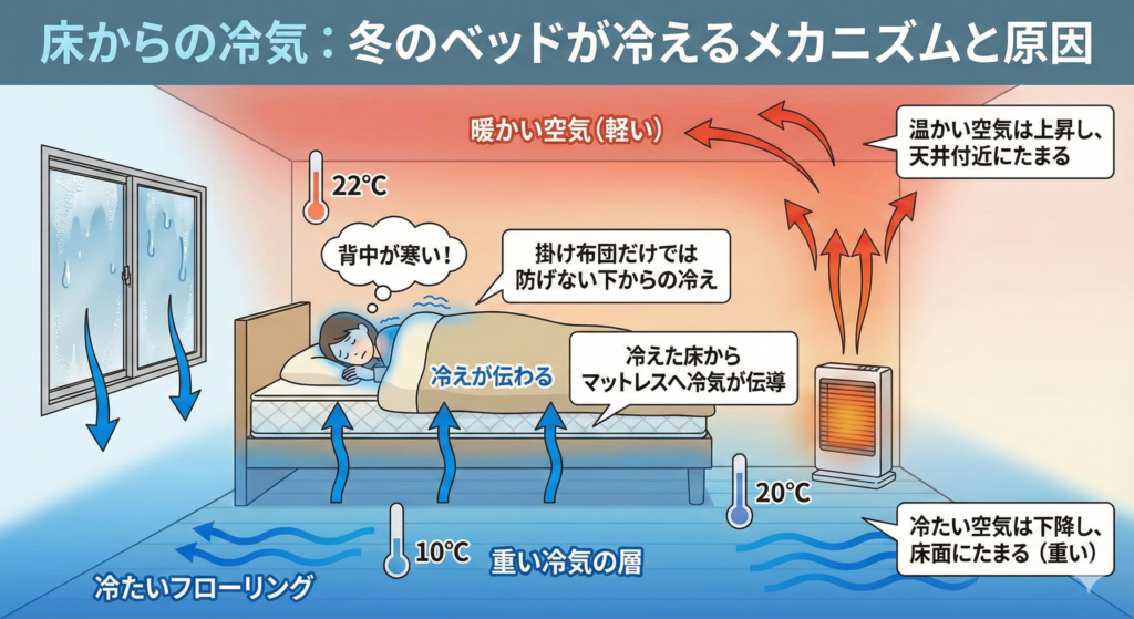 冷たい空気は暖かい空気より重いため、床面に冷気がたまりやすいという物理的な特性があります。フローリングの床は特に冷えやすく、その冷気がベッドの下からマットレスを通じて体に伝わります。