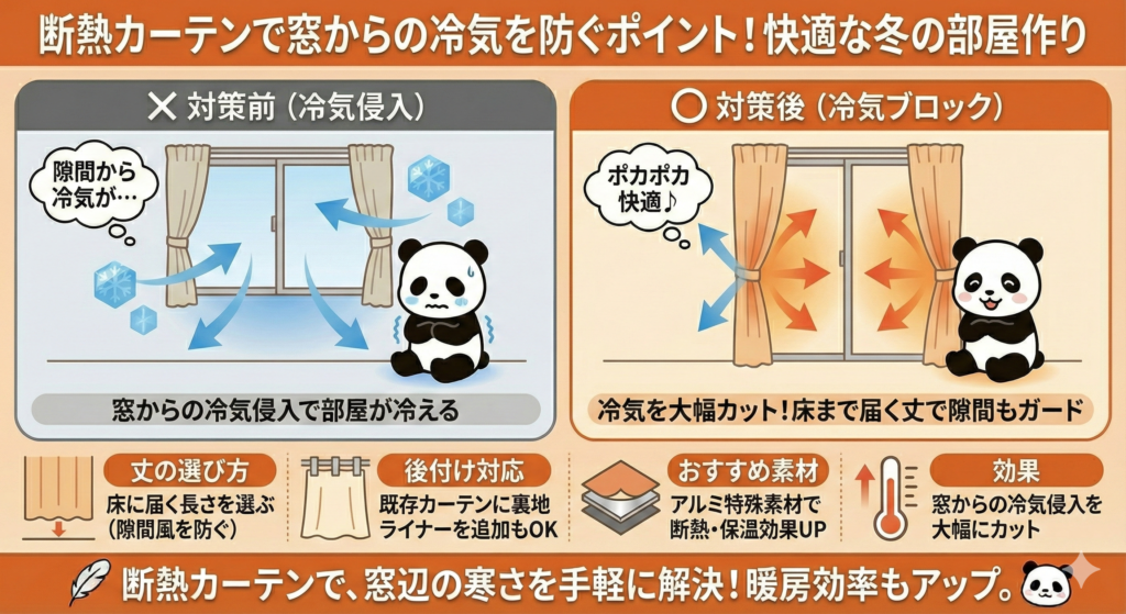 窓に断熱カーテンを取り付けることで、冷気の侵入を大幅に減らせます。床に届く長さのカーテンを選ぶと、隙間からの冷気流入も防げます。