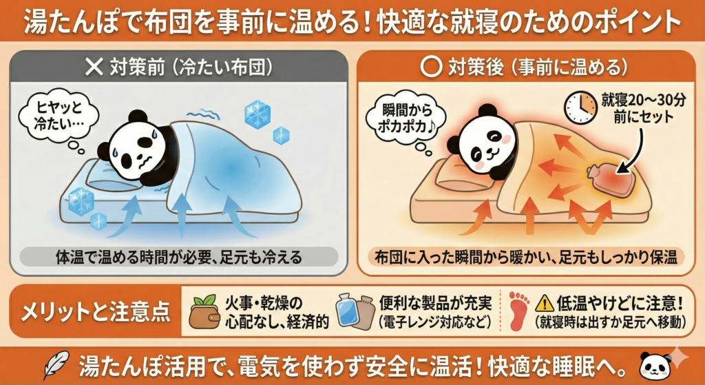 布団が冷たいと、体温で温まるまでに時間がかかります。就寝20〜30分前に湯たんぽを入れておくことで、布団に入った瞬間から暖かさを感じられます。