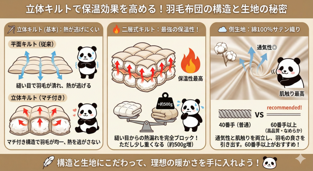 羽毛布団の暖かさは、キルティング(縫製方法)にも左右されます。最も一般的なのは「立体キルト」で、マチがあるため羽毛が入らない部分が少なく、熱が逃げにくい構造になっています。