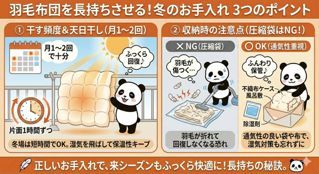 羽毛は吸放湿性に優れているため、毎日干す必要はありません。月に1〜2回、天気の良い日に干す程度で十分です。