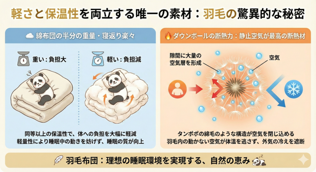 羽毛布団の最大の特徴は、軽いのに暖かいという相反する性質を両立している点です。綿布団と比べて重量は半分程度でありながら、保温性は同等以上。体への負担が少なく、寝返りも打ちやすいため、睡眠の質を高めます。